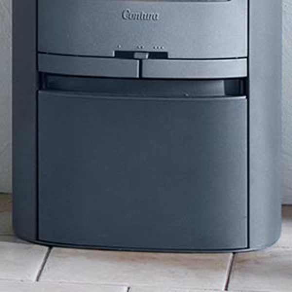 Ein praktisches integriertes Fach unter dem Kaminofen, dass für eine ordentliche Aufbewahrung des Brennholzes sorgt
