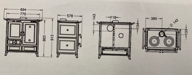 - unterer emaillierter Backofen (Fassungsvermögen 35 l) mit Steinboden